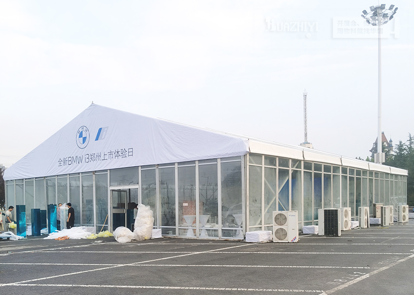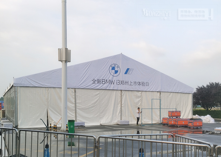 鄭州篷房租賃公司助力寶馬i3上市體驗會,本次我們來到了寶馬體驗會的活動現場,活動現場是由搭建的白色篷房是主會場,篷房內部的頂部是由白色紗幔來進行裝飾的。
