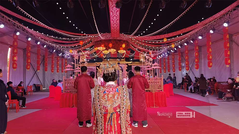 婚慶篷房燈光布置的首要任務是基礎照明,確保篷內無光線死角。焦作婚禮篷房出租推薦按篷房面積搭配合適的基礎燈具,100-200㎡的中小型篷房,可懸掛6-8盞400W的帕燈,均勻分布在篷頂桁架上,光線柔和且覆蓋范圍廣。安裝時需注意燈具高度,距離地面不低于2.8米,避免遮擋視線或造成安全隱患。