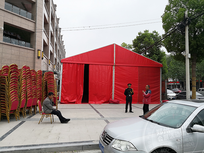 登封中天廣場紅色篷房租賃由鄭州華熠篷房提供,此次所搭建的篷房是一款大紅色活動篷房租賃。從圖中所示,我們可以看出活動所選用的地址是街道邊的水泥地上。篷房搭建不受場地限制,可以在水泥地上、土地上或者草地上等進行施工。