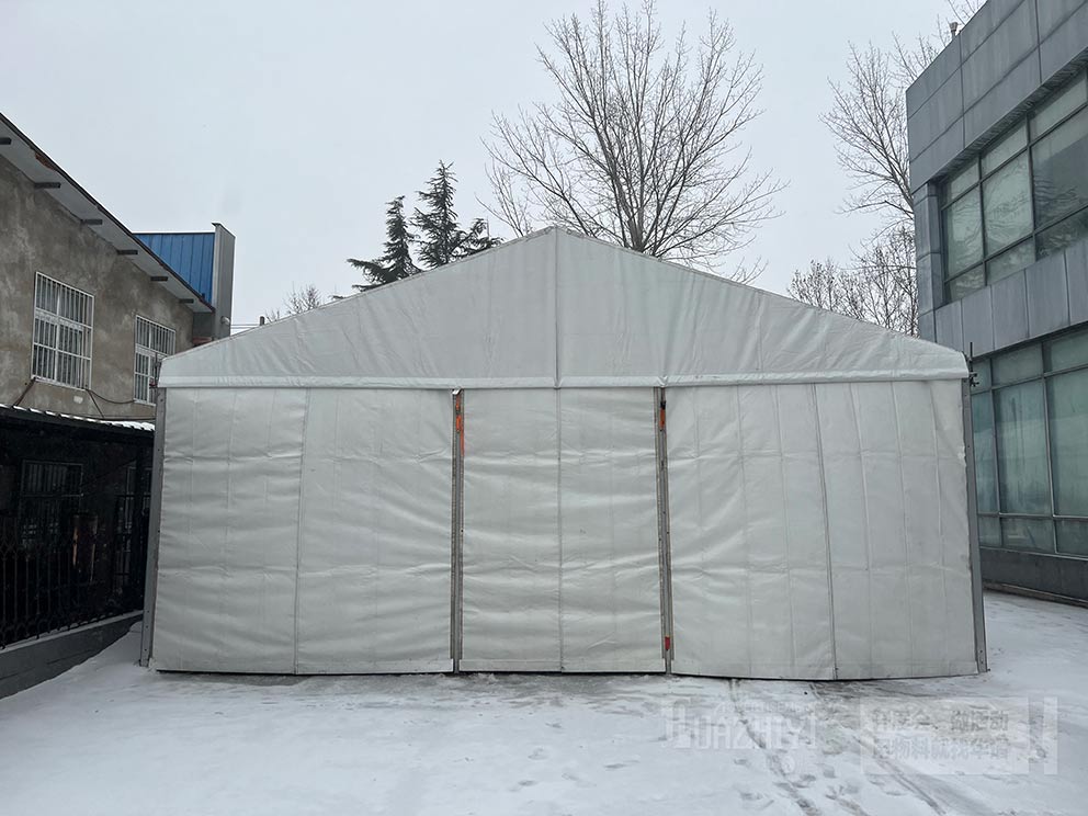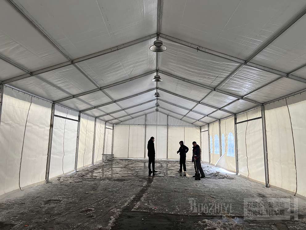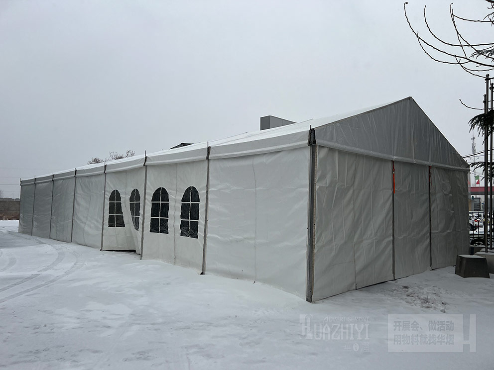 華之熠篷房的篷布是有保溫材料的,可以阻擋一部分寒冷空氣,同時(shí)建議您配備上取暖設(shè)備,正常開啟暖風(fēng)機(jī)或空調(diào)的情況下,在雪天,篷房頂部也不會有太多積雪,也能夠進(jìn)一步提高室內(nèi)溫度,確保篷內(nèi)工作人員可以感受到溫暖和舒適。