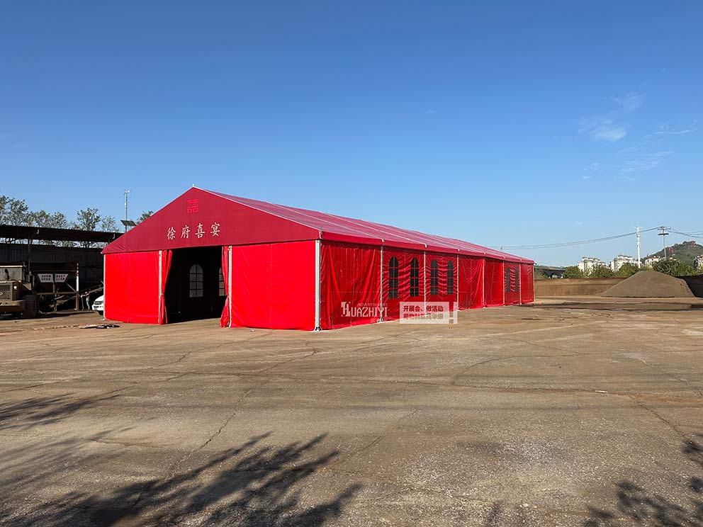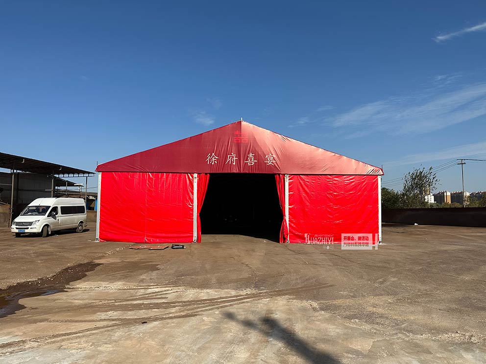 鄭州婚慶篷房出租公司搭建紅色喜篷現(xiàn)場。總之,鄭州婚慶篷房出租公司以其專業(yè)的技術(shù)實力、獨特的設(shè)計理念和周到的服務(wù),贏得了廣大新人的認(rèn)可和信賴。在未來的日子里,我們將繼續(xù)為更多的新人打造出一個又一個夢幻般的婚禮現(xiàn)場。
