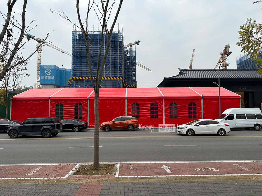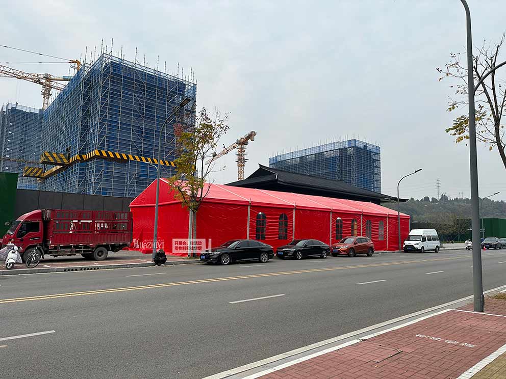 首先,選址要合理。地產開盤篷房的搭建應選擇平坦、堅實且無遮擋物的場地,確保篷房能夠穩固搭建,避免因地質條件不良或風力過大導致的安全問題。同時,要考慮場地的交通便捷性,確保人員和車輛的順利出入。