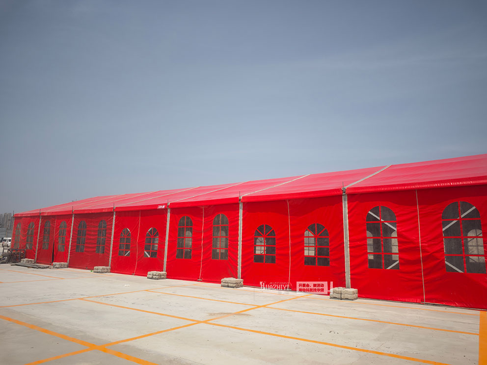 婚慶篷房是夏季婚禮市場的熱門之選。以紅色篷房為例,其鮮艷色彩契合傳統婚慶氛圍,鋁合金框架搭配雙層PVC篷布。內部可靈活配置水晶吊燈、紗幔、地毯等裝飾,結合空調系統,打造舒適浪漫的婚禮空間。鄭州華熠公司曾為多場戶外婚禮提供此類篷房,滿足新人對時效與美學的雙重需求。