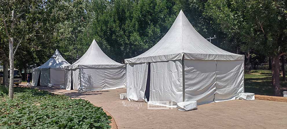 首先是設計時尚美觀的尖頂篷房,鄭州篷房租賃公司尖頂篷房采用高強度鋁合金框架和防水防曬PVC材質,內部空間無立柱設計,視野開闊,很適合在炎熱的夏天舉辦各種戶外活動時使用。