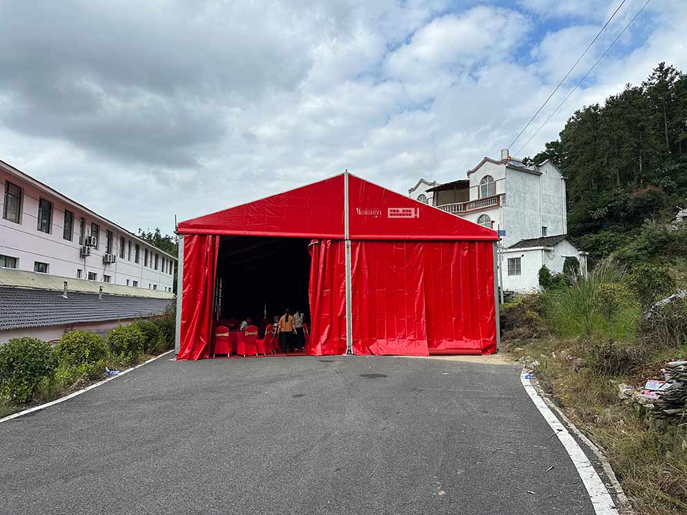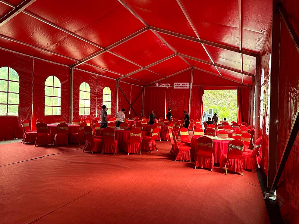 焦作篷房租賃為婚禮搭建的紅色篷房,是整個場地布置的核心亮點。篷房采用大跨度人字形設計,篷身選用高密度紅色PVC篷布,色澤濃郁飽滿,在陽光下呈現(xiàn)出熱烈而不失莊重的質(zhì)感;篷布表面經(jīng)過特殊處理,不僅防雨防曬,還能有效提升篷內(nèi)亮度。